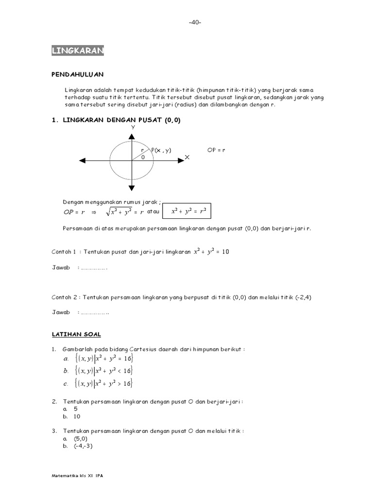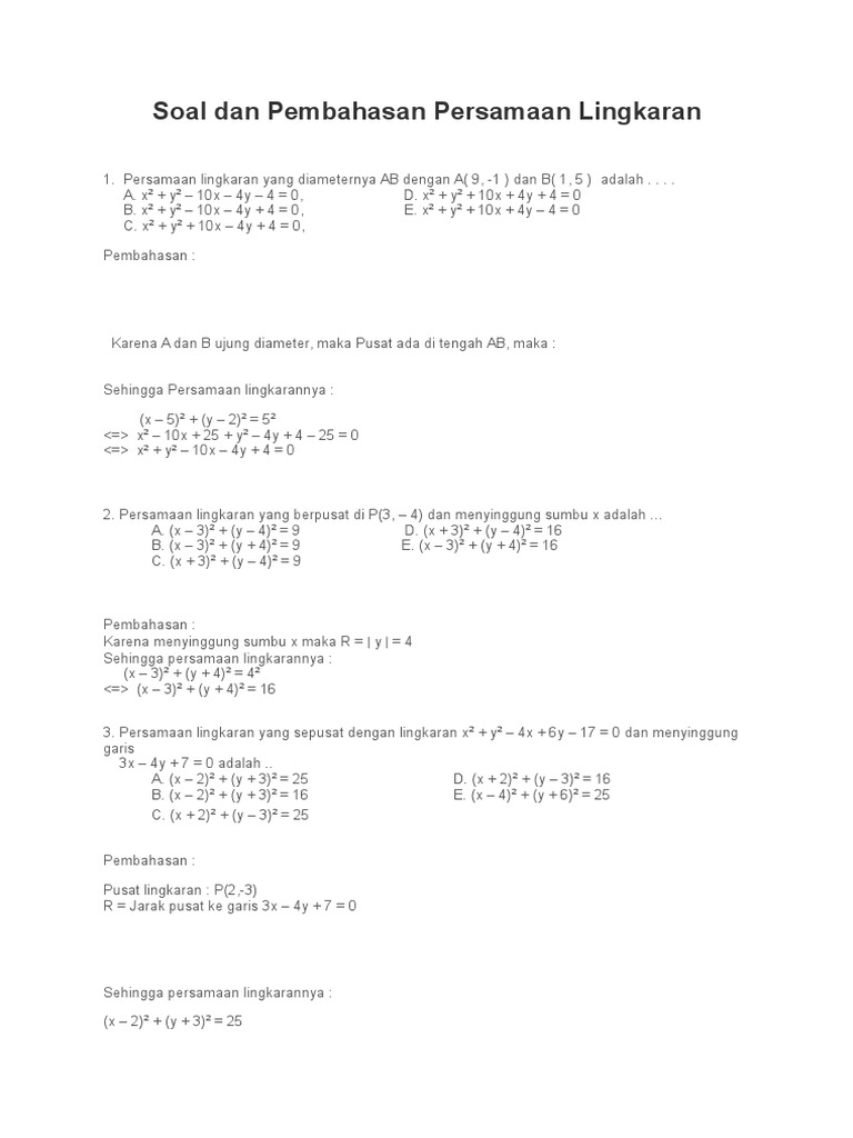 Contoh soal dan jawaban bilangan berpangkat smk. Biasanya dalam soal soal materi persamaan lingkaran tersebut terdapat hubungan antara titik pusat lingkaran dengan titik tertentu. Berikut ini merupakan soal dan pembahasan materi persamaan lingkaran yang merupakan salah satu hasil irisan kerucut pada kajian geometri analitik. Untuk pembahasan yang lebih lengkap akan di bahasa pada artikel selanjutnya. Jarak dari setiap titik ke titik pusat biasa disebut. Contoh soal contoh soal 1. Contoh soal integral tentu tak tentu substitusi parsial. Kumpulan soal dan pembahasan sistem persamaan linier dua. Contoh soal persamaan lingkaran, rumus persamaan lingkaran, cara mencari titik pusat lingkaran, persamaan lingkaran melalui titik pusat. Persamaan garis singgung lingkaran yang akan dibahas melalui halaman ini akan dibedakan dalam 3 kondisi. Jangan lupa untuk mengunjungi artike lainnya. Untuk lebih memahami materi persamaan lingkaran, mari kita lihat contoh soal dan pembahasan materi persamaan lingkaran berikut Postingan ini membahas contoh soal persamaan lingkaran dan penyelesaiannya atau pembahasannya.